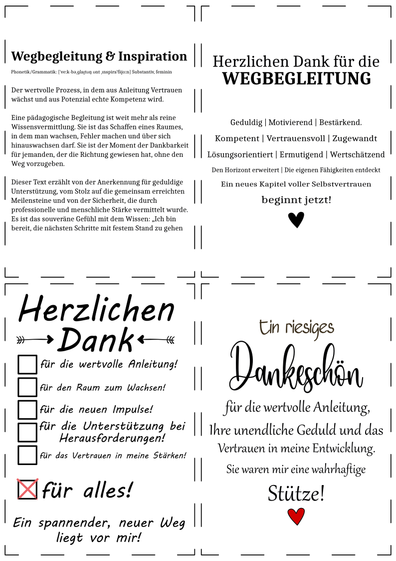 Danke für die Wegbegleitung: 4 edle Kartendesigns + 59 Textvorlagen (inkl. Vorlagen für Praxisanleitung, Schulbegleiter & emotionale Dankesworte).